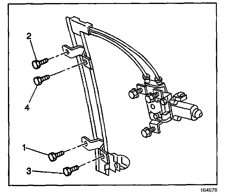 6. Remove the window regulator to door bolts (1,2,3,4).