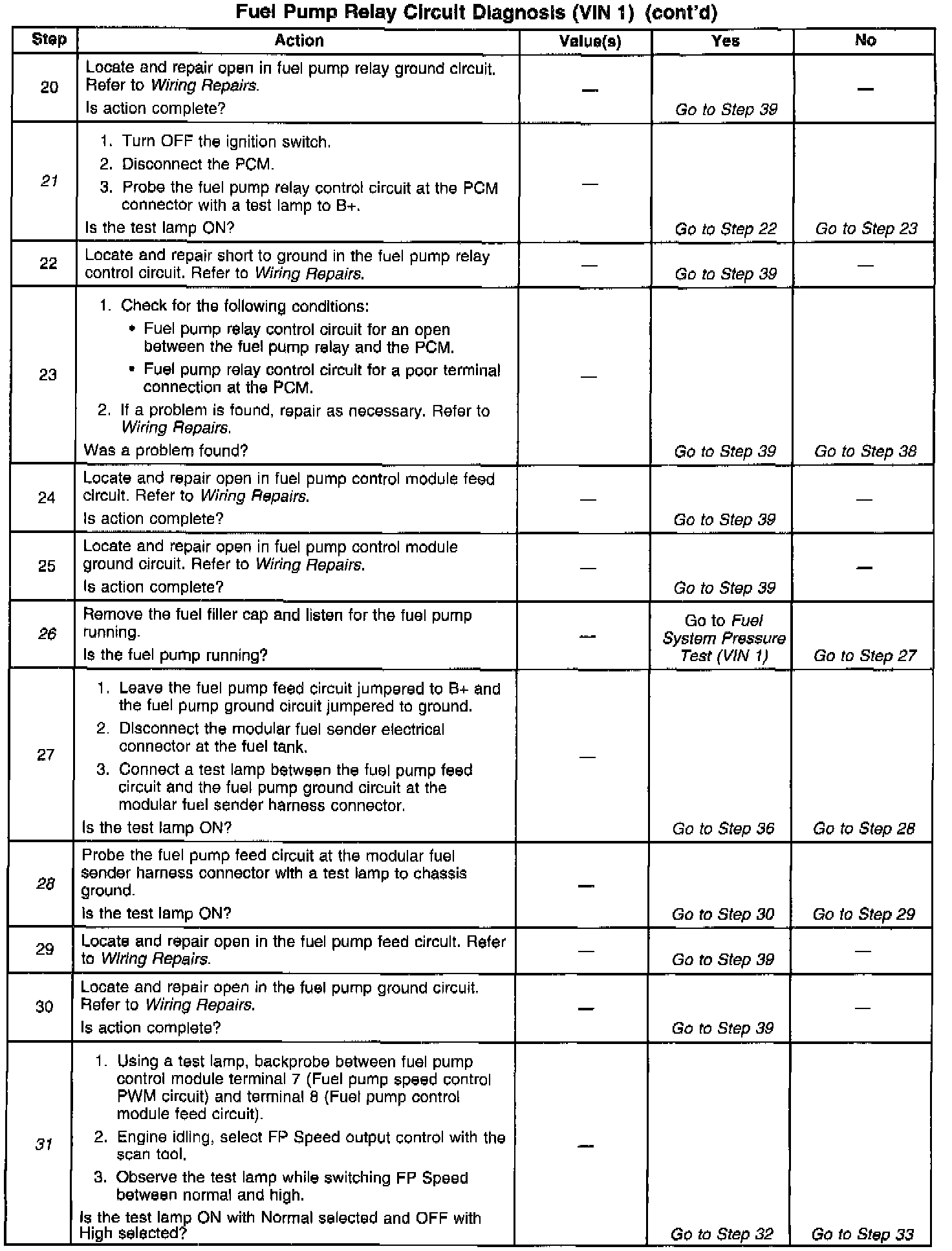 26. If the fuel pump is operating but incorrect pressure is observed, the fuel pump wiring is OK and the Fuel System Pressure Test should be used for diagnosis.