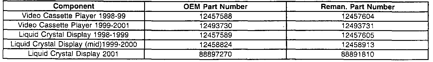 The following exchange program for the Video Cassette Player (VCP) and LCD Video Screen has been set-up for vehicles within the warranty period. This exchange program must be utilized when the diagnostic procedures in the Service Manual or the Electronic Service Information lead the technician to replacement of these units.