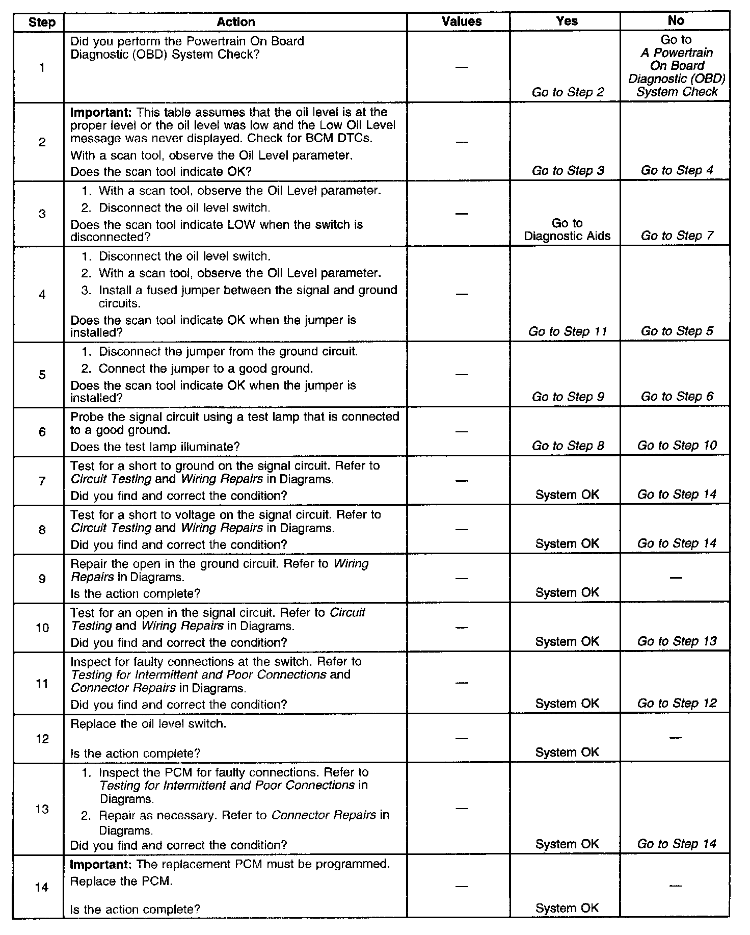 The engine oil level switch is a simple float switch that is grounded when the engine oil level is OK. The Powertrain Control Module (PCM) checks the engine oil level switch circuit at start-up. Before checking the state of the engine oil level switch, the PCM performs a test routine based on time and Engine Coolant Temperature (ECT) to ensure that the engine oil has drained back into the sump. To test for low oil level at start-up, both of the following conditions must be present: