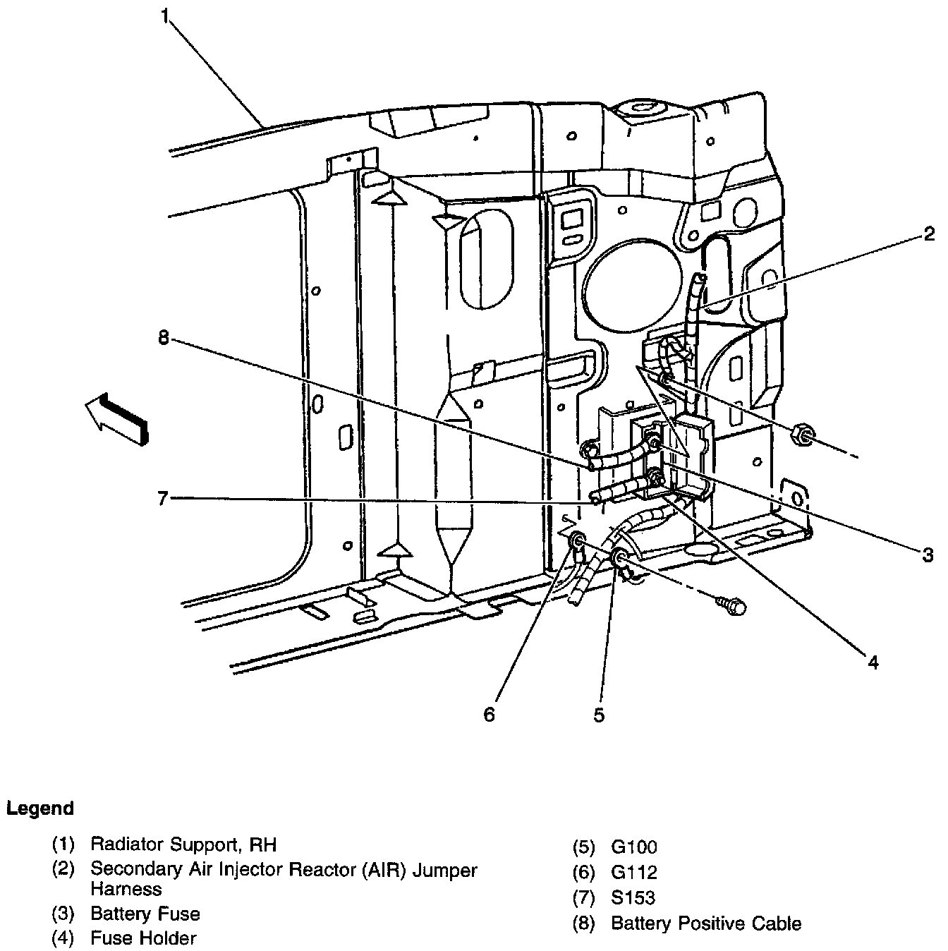 On the lower right side of the radiator support, below the battery