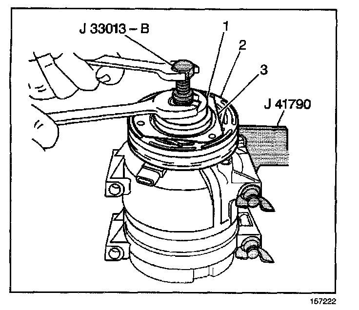 5. Install the J 33013-B and bearing tools (1) onto the clutch plate (3) and the hub assembly (2).
