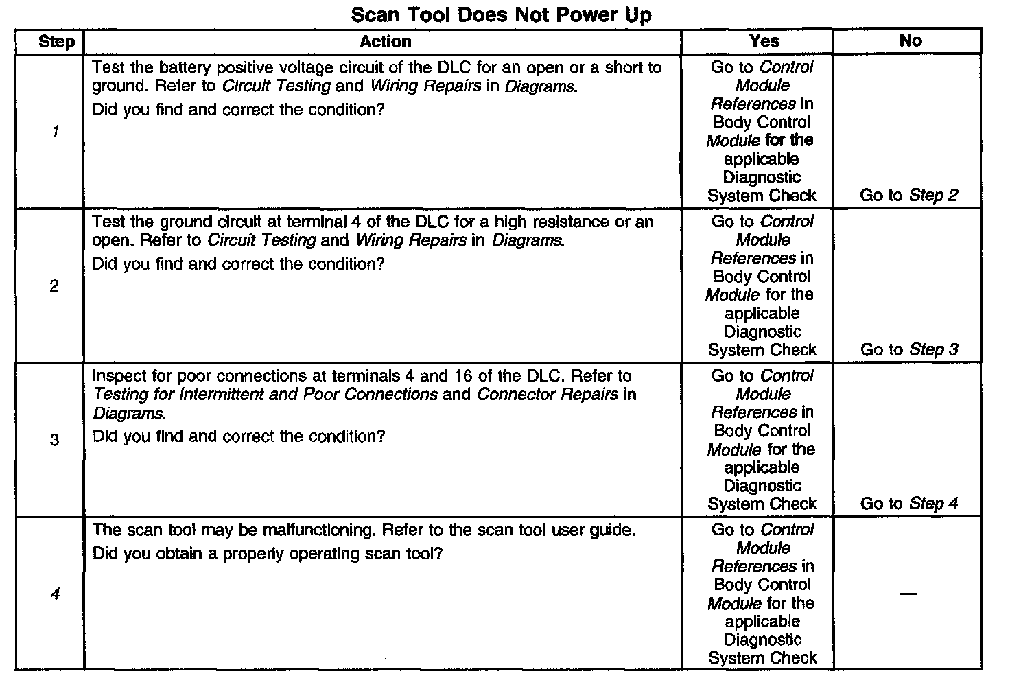 CIRCUIT DESCRIPTIONThe data link connector (DLC) provides operating power for the scan tool at terminal 16 (battery positive voltage) and at terminal 4 (battery negative voltage). The DLC provides the class 2 serial data signal at terminal 2 and signal ground at terminal 5. The scan tool will power up with the ignition off. Many modules, however, may not communicate unless the ignition is on.