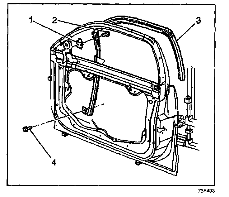 7. Remove the window run channel weather-strip (3) from the front door window.