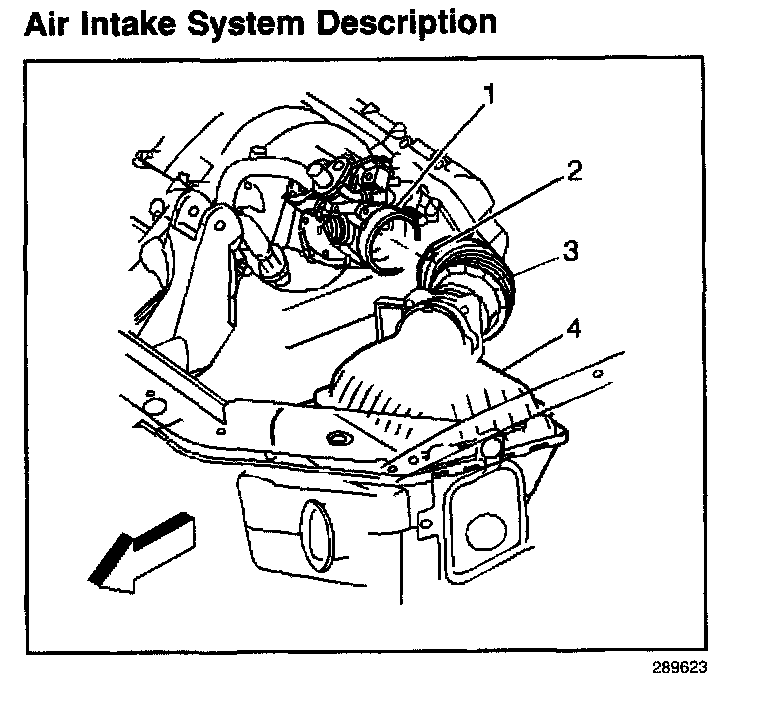 The air induction system provides contaminant and sound filtration of the outside air as the air is drawn into the engine. A remotely mounted air cleaner prevents contaminants in the air from entering the engine. The air cleaner assembly (4) also acts as a resonator to reduce any air induction noise. The filtered air then enters the engine by flowing through the intake air duct (3), the throttle body (1), into the intake manifold, through the cylinder head intake ports, and finally into the cylinders.