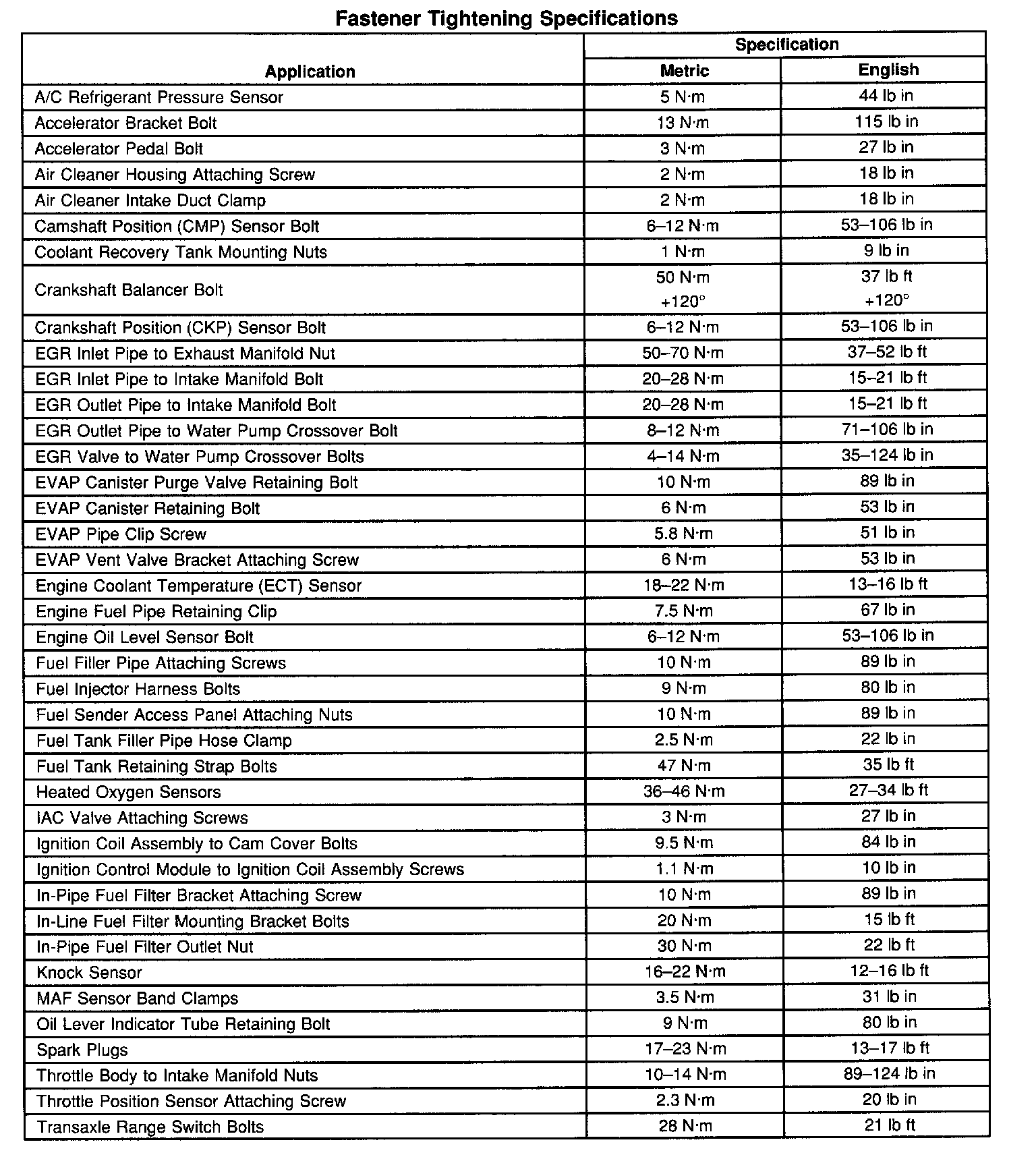 Fastener Tightening Specifications:
