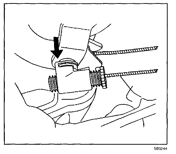 8. Connect the cruise control cable locator clip to the rectangular hole in the routing bracket.