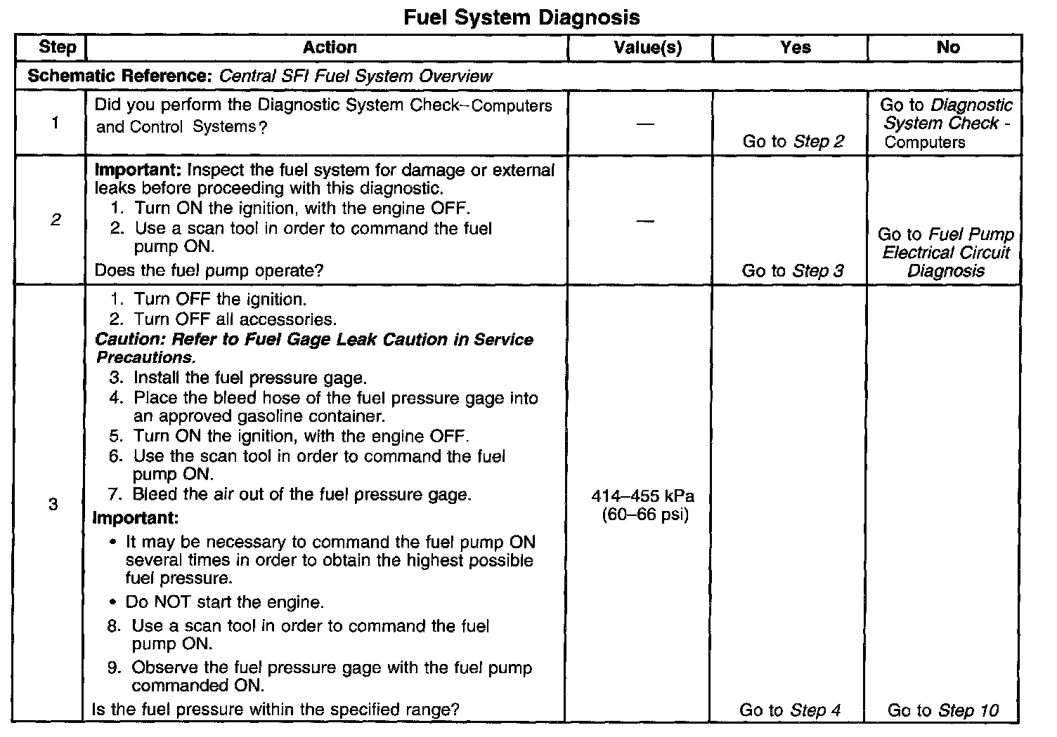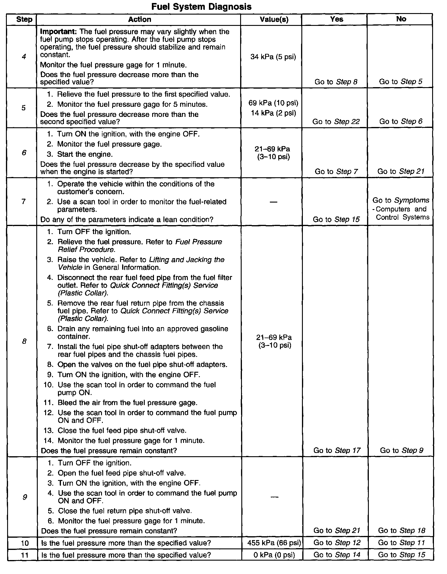 4. This step tests for an internal fuel leak. If the fuel pressure decreases during this test, an internal loss of pressure is indicated.