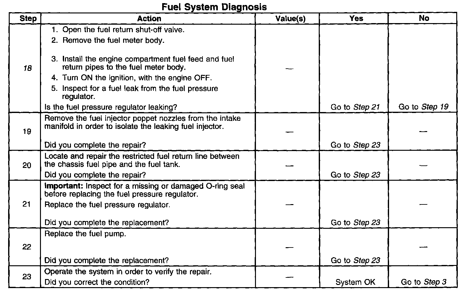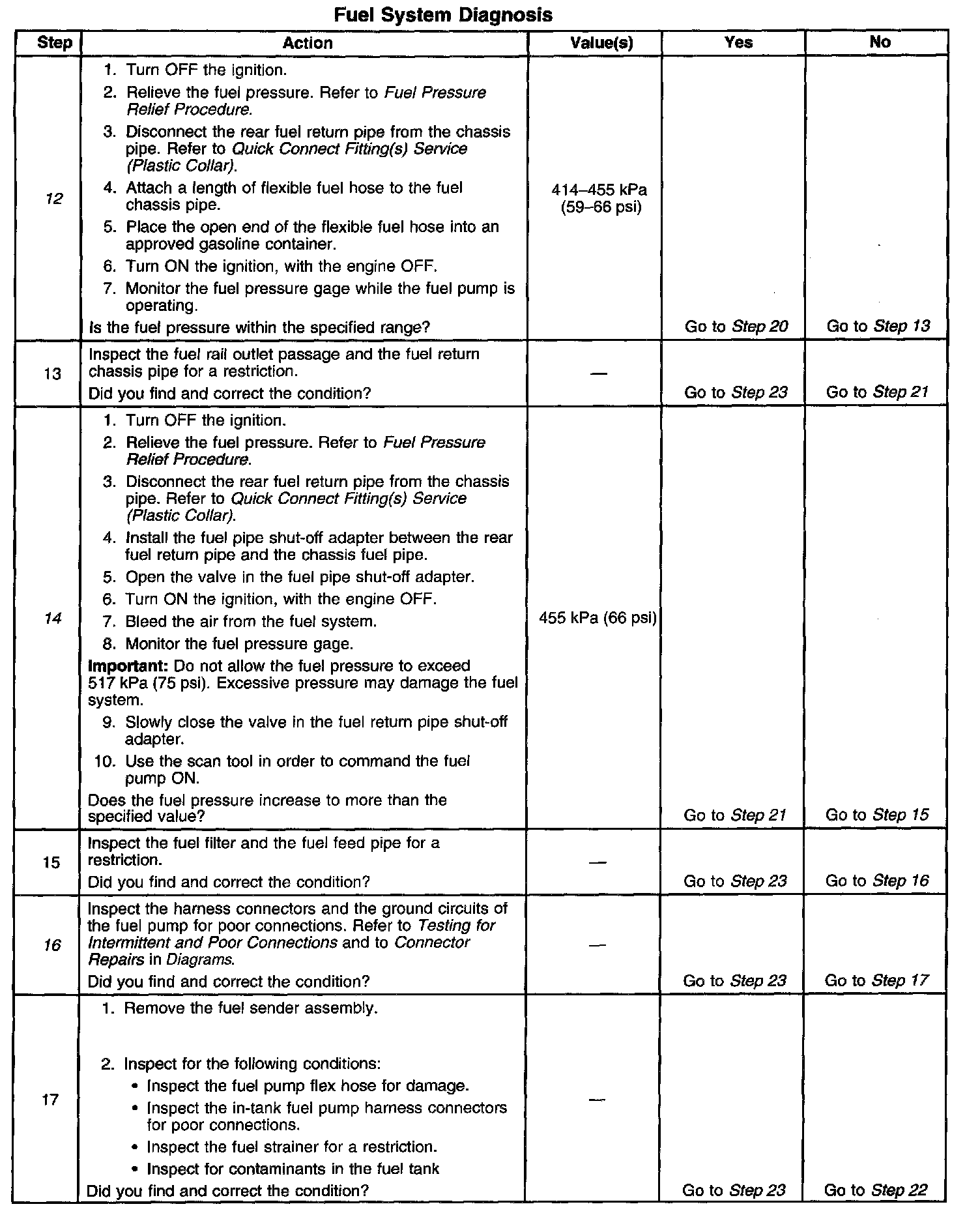 12. This step tests for a restricted fuel return pipe. If the fuel pressure is within the specified range, a restriction in the fuel return pipe is indicated.