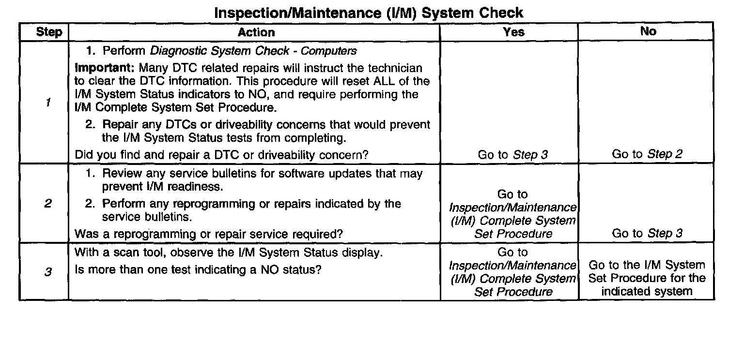 1. Any DTCs set, even those that are not listed in the Inspection/Maintenance System DTC Table, may prevent the required DTCs from running. If there is any question as to whether a set DTC is disabling the required I/M diagnostic, review the Conditions for Running in the diagnostic procedures for the DTC required by the I/M diagnostic. A list of disabling DTCs, if applicable, is contained in the supporting text for that DTC.