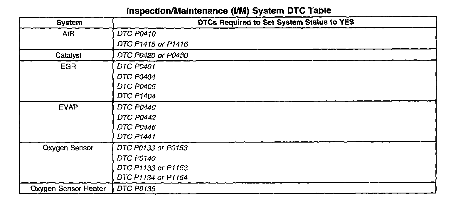 Inspection/Maintenance (I/M) System DTC Table: