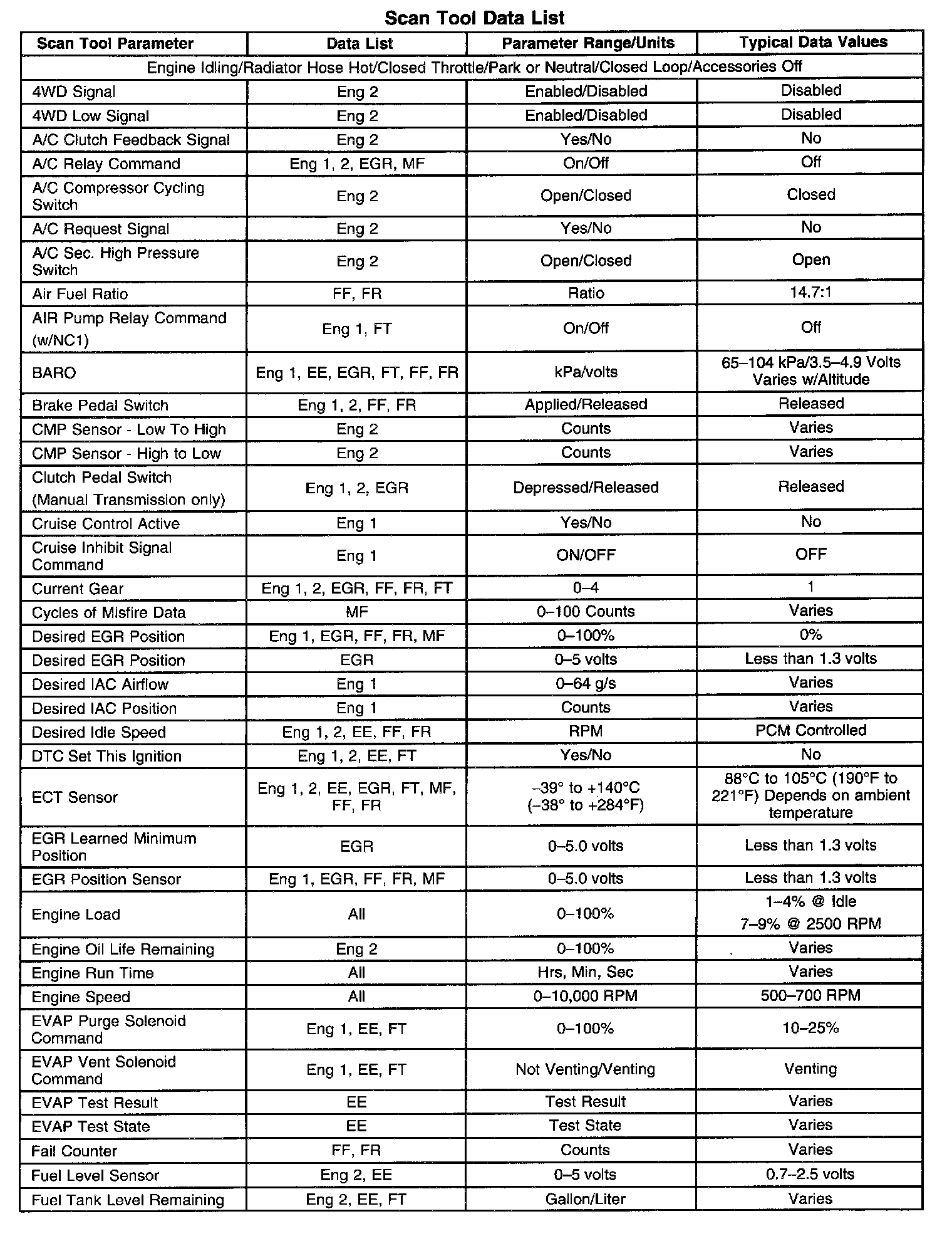 The Engine Scan Tool Data List contains all engine related parameters that are available on the scan tool. The list is arranged in alphabetical order. A given parameter may appear in any one of the data lists, and in some cases may appear more than once, or in more than one data list in order to group certain related parameters together.