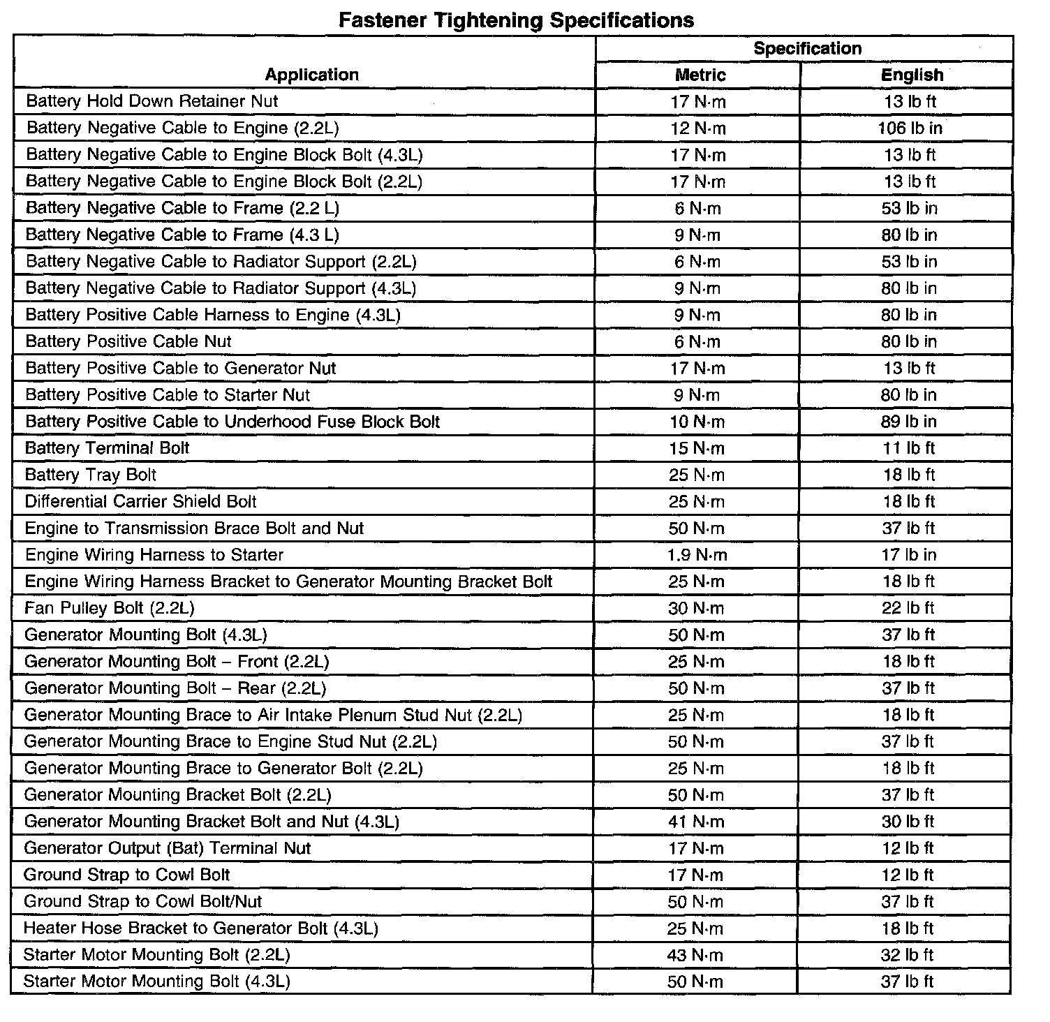 Fastener Tightening Specifications: