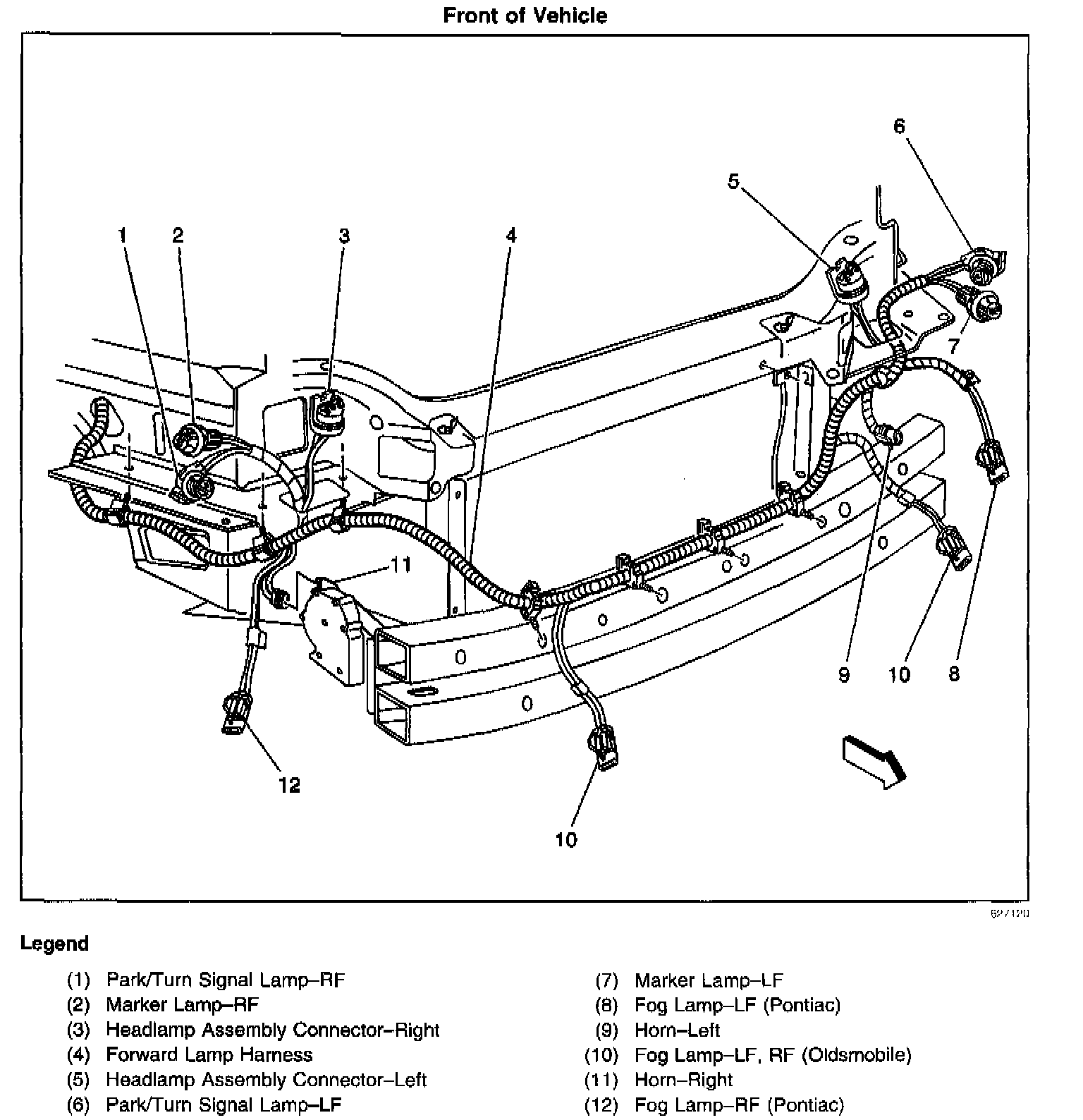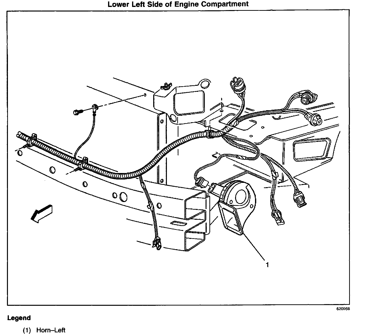 Front left side of the vehicle, mounted to the left side of the front lower crossmember