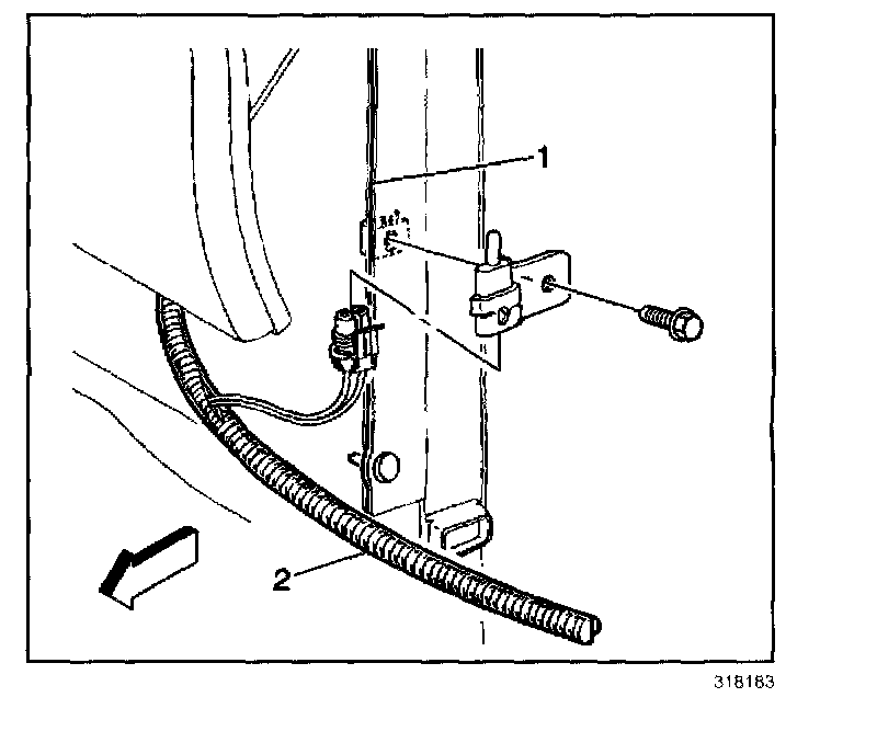 The radiator support flange (1) mounts the ambient outside air temperature sensor near the radiator baffle. A 2-wire weather pack electrical connector attaches the ambient outside air temperature sensor to the forward lamp harness (2). In order to service the ambient outside air temperature sensor, perform the following steps: