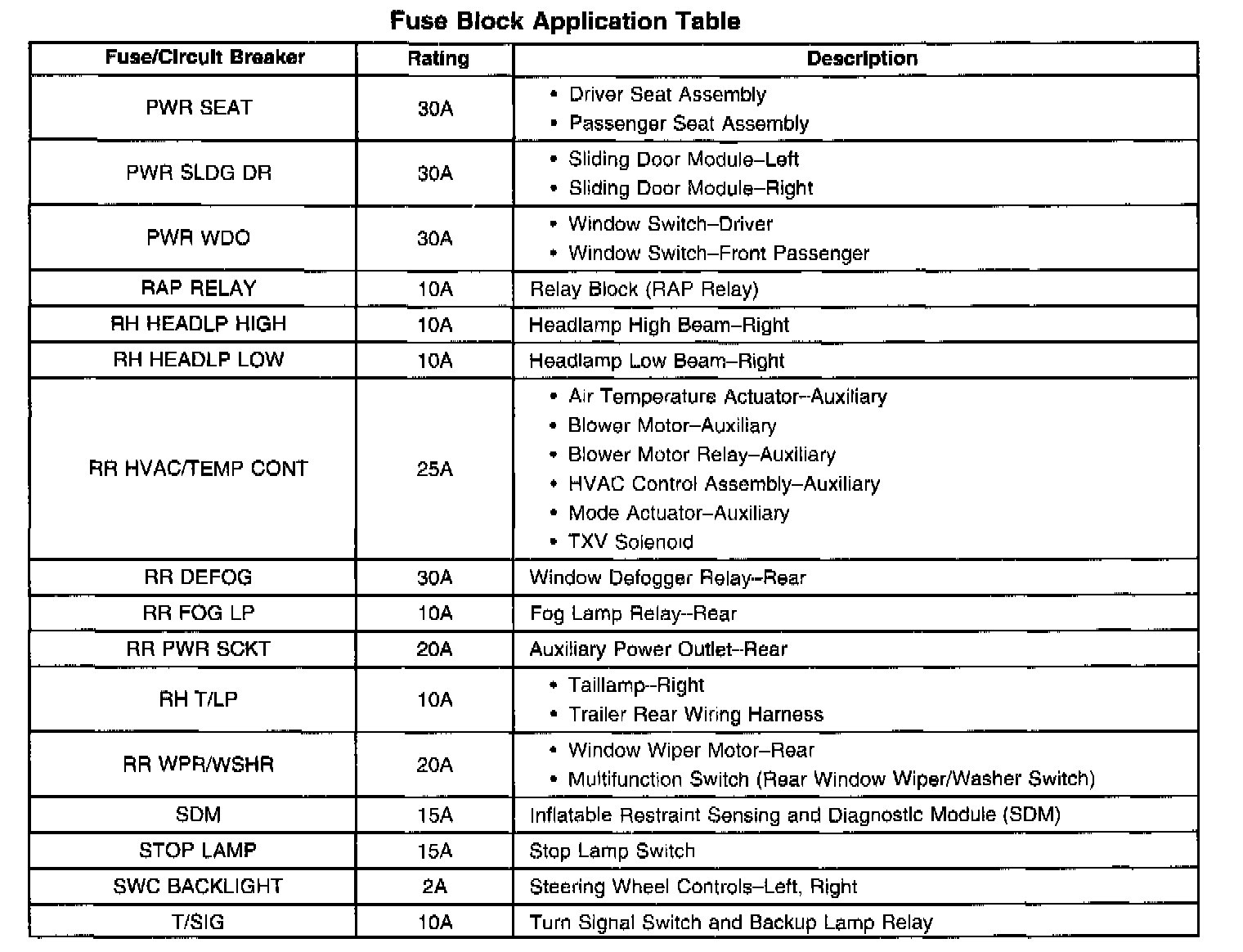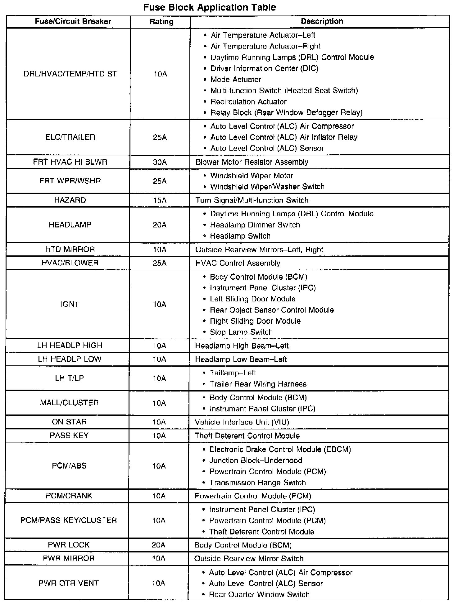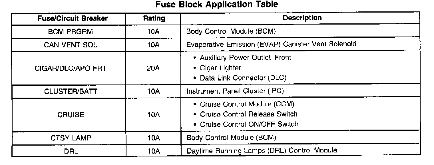 Fuse Block Application Table