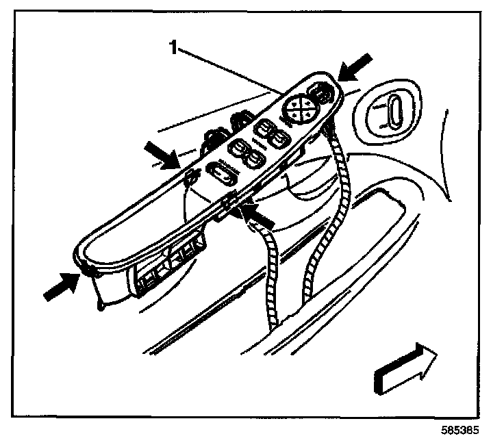 2. With a small flat-bladed tool, push in and lift up to release the retaining clips for the accessory switch plate (1).