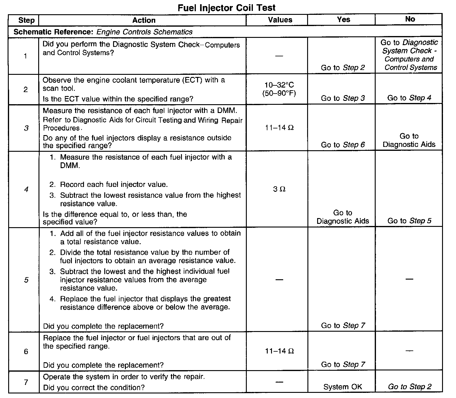 4. This step determines if all of the fuel injectors are within 3 ohms of each other. If the highest resistance value is within 3 ohms of the lowest resistance value, then all of the fuel injector coil windings are OK.