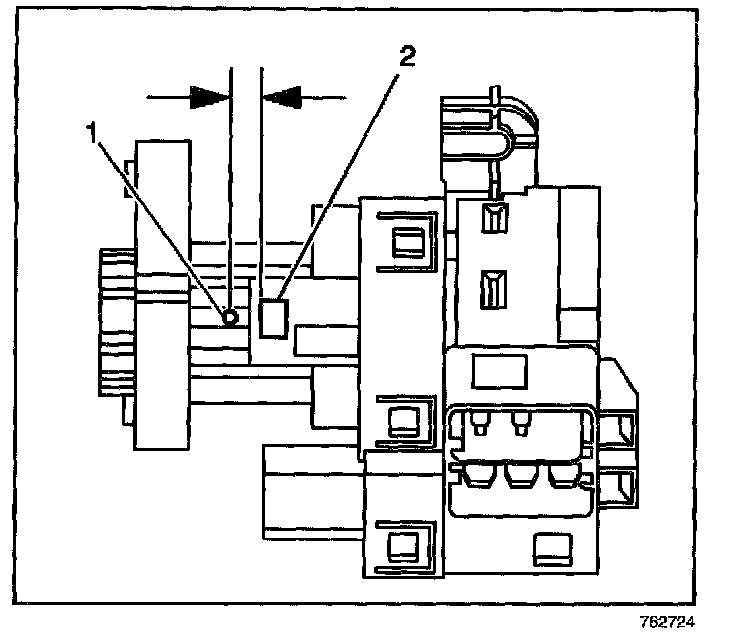9.2. Locate the surface for the release button (2) on the plastic ignition switch housing, and center punch a location (1) on the rib 9.5 mm (3/8 in) rearward, toward the key entry end, from the cylinder release button.