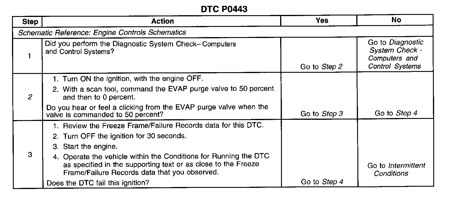 CIRCUIT DESCRIPTIONAn ignition voltage is supplied directly to the evaporative emission (EVAP) purge valve. The EVAP purge valve is pulse width modulated (PWM). The control module controls the EVAP purge valve on time by grounding the control circuit via an internal switch called a driver. The scan tool displays the amount of ON time as a percentage. The control module monitors the status of the driver. If the control module detects an incorrect voltage for the commanded state of the driver, diagnostic trouble code (DTC) P0443 sets.