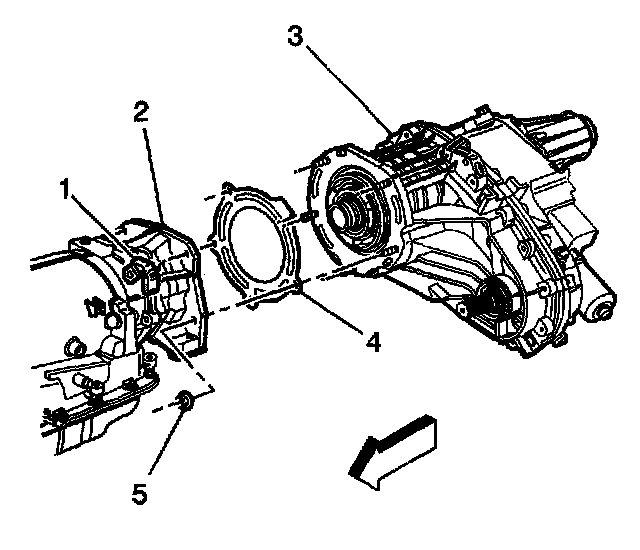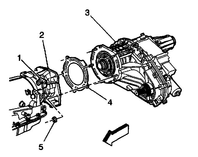 13. Remove the transfer case adapter (2) to transfer case nuts (5).