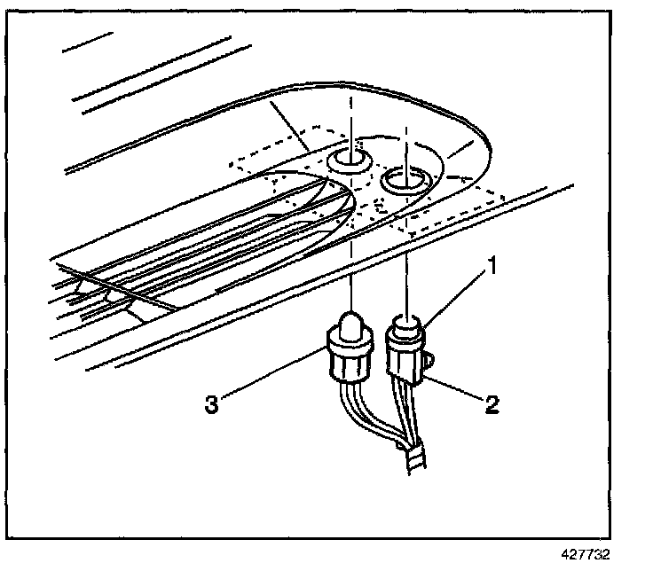 2. Disconnect the sunload sensor (1) and the daytime running lamp (DRL) light sensor (3) from the defroster grille.