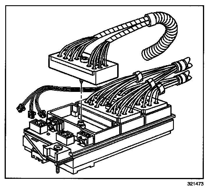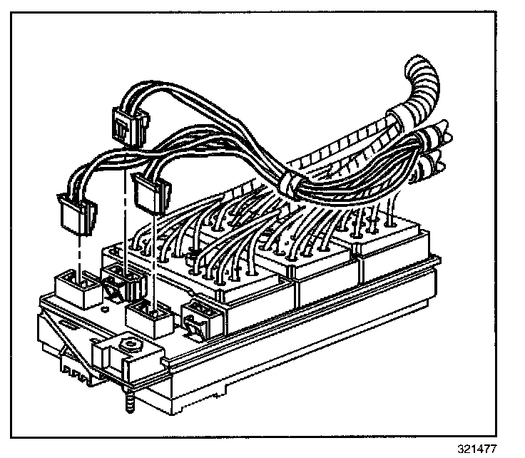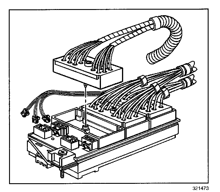 6. Loosen the bolts retaining the engine, IP and forward lamp wiring harness connectors to the junction block.
