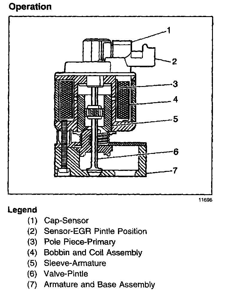 The linear EGR valve is designed to accurately supply EGR to an engine independent of the intake manifold vacuum. The valve controls the EGR flow from the exhaust to the intake manifold through an orifice with a PCM controlled pintle. During operation, the PCM controls the pintle position by monitoring the pintle position feedback signal. The feedback signal can be monitored with a scan tool as the Actual EGR Position. The Actual EGR Position should always be near the commanded EGR position, Desired EGR Position. The PCM uses information from the following sensors to control the pintle position: