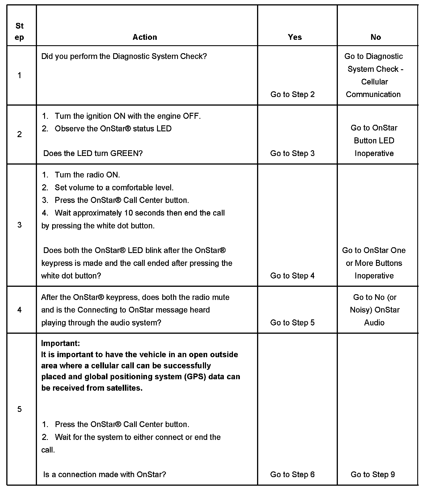 This symptom table will enable the user to verify the customer complaint and narrow it to its source. If there is a concern with voice recognition or OnStar(R) steering wheel control function, technicians should proceed directly to the applicable diagnostic in Symptoms - Cellular Communication.
