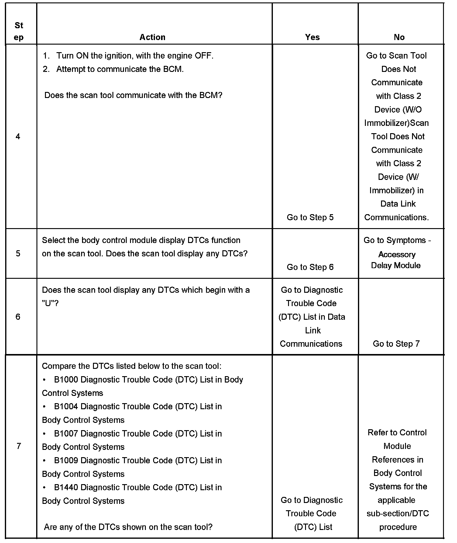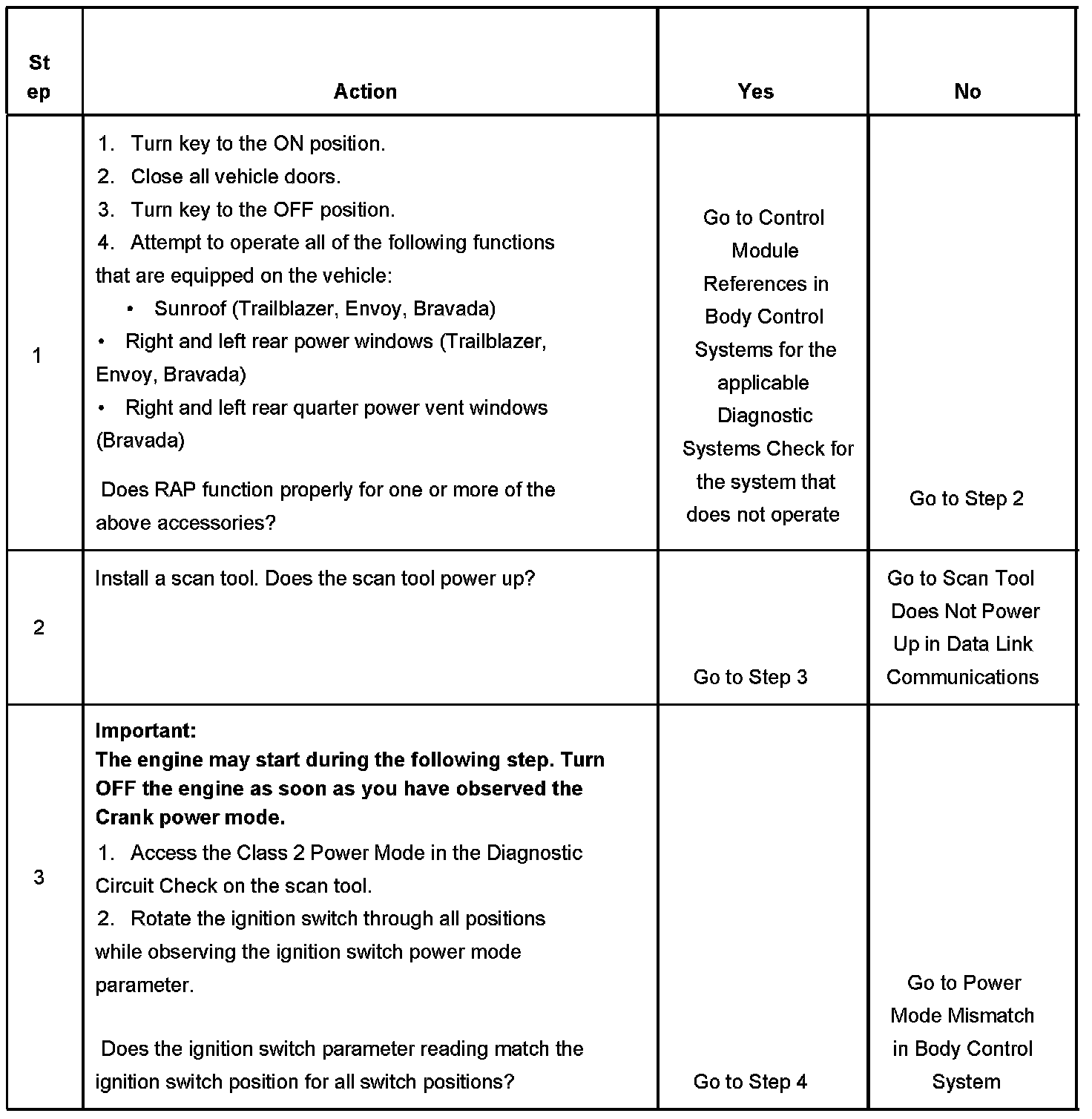 4. The BCM sends Class 2 messages to other control modules via the serial data link, allowing them to operate in RAP power mode. Lack of communication may be due to a partial malfunction of the class 2 serial data circuit or due to a total malfunction of the class 2 serial data circuit. The specified procedure will determine the particular condition.
