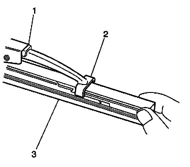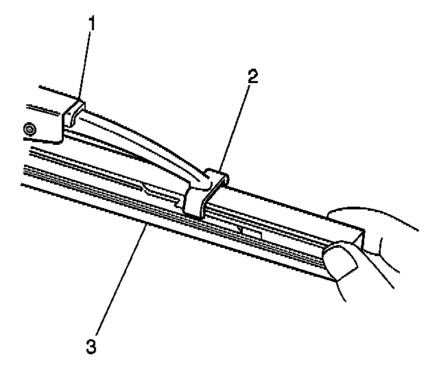 3. Engage the bottom claw (2) of the wiper blade (1) into the notches in wiper blade element (3).