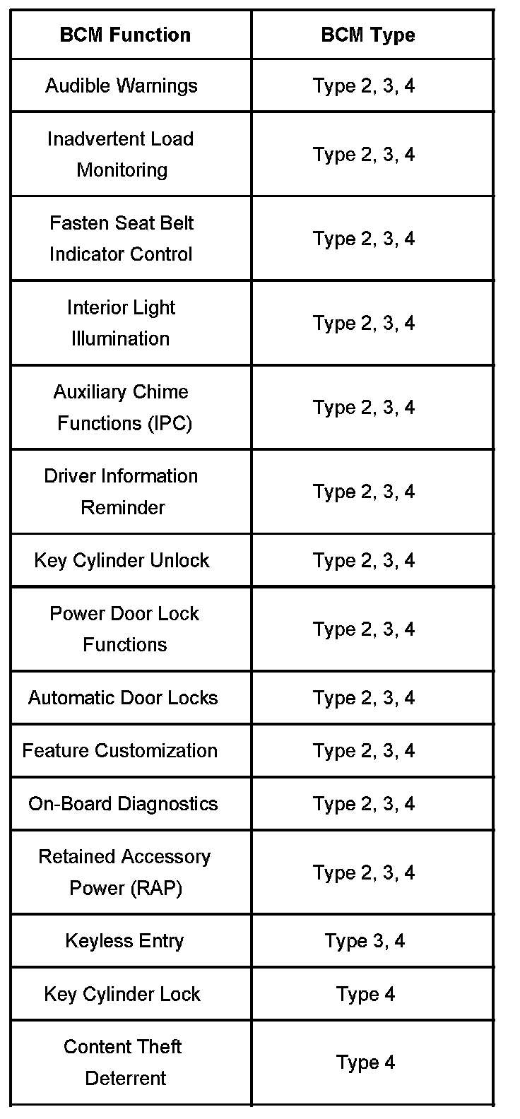 Refer to On-Board Diagnostic Features for more information on how to identify the BCM type installed by using the on-board diagnostic feature. The following identifies the functions and basic option content of all 3 BCM types: