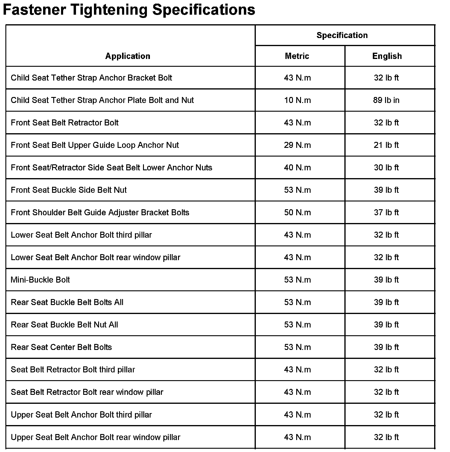 Fastener Tightening Specifications: