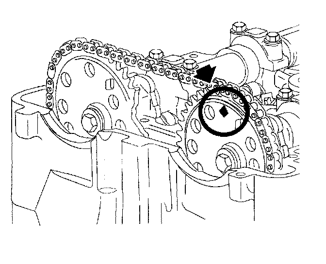 3. Place the copper colored link (1 ) so that it lines up with the timing mark on the intake side balance shaft sprocket.