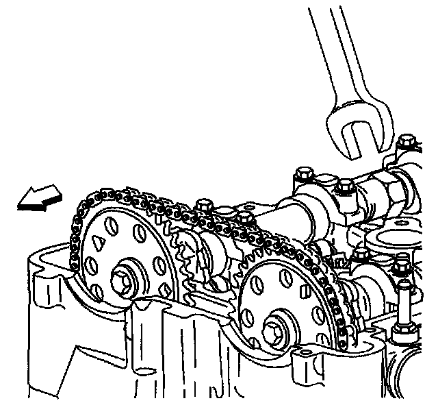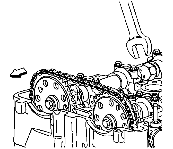 Important: To rotate the camshaft, use a 24 mm open-end wrench on the camshaft flats. Camshaft should be rotated in a clockwise direction only, facing camshaft sprockets from the passenger side of the vehicle.