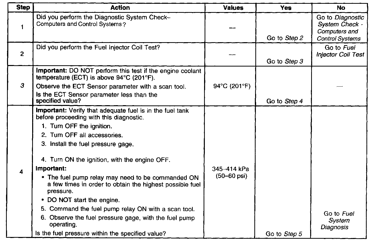 3. The engine coolant temperature (ECT) must be below the operating temperature in order to avoid irregular fuel pressure readings due to hot soak fuel boiling.