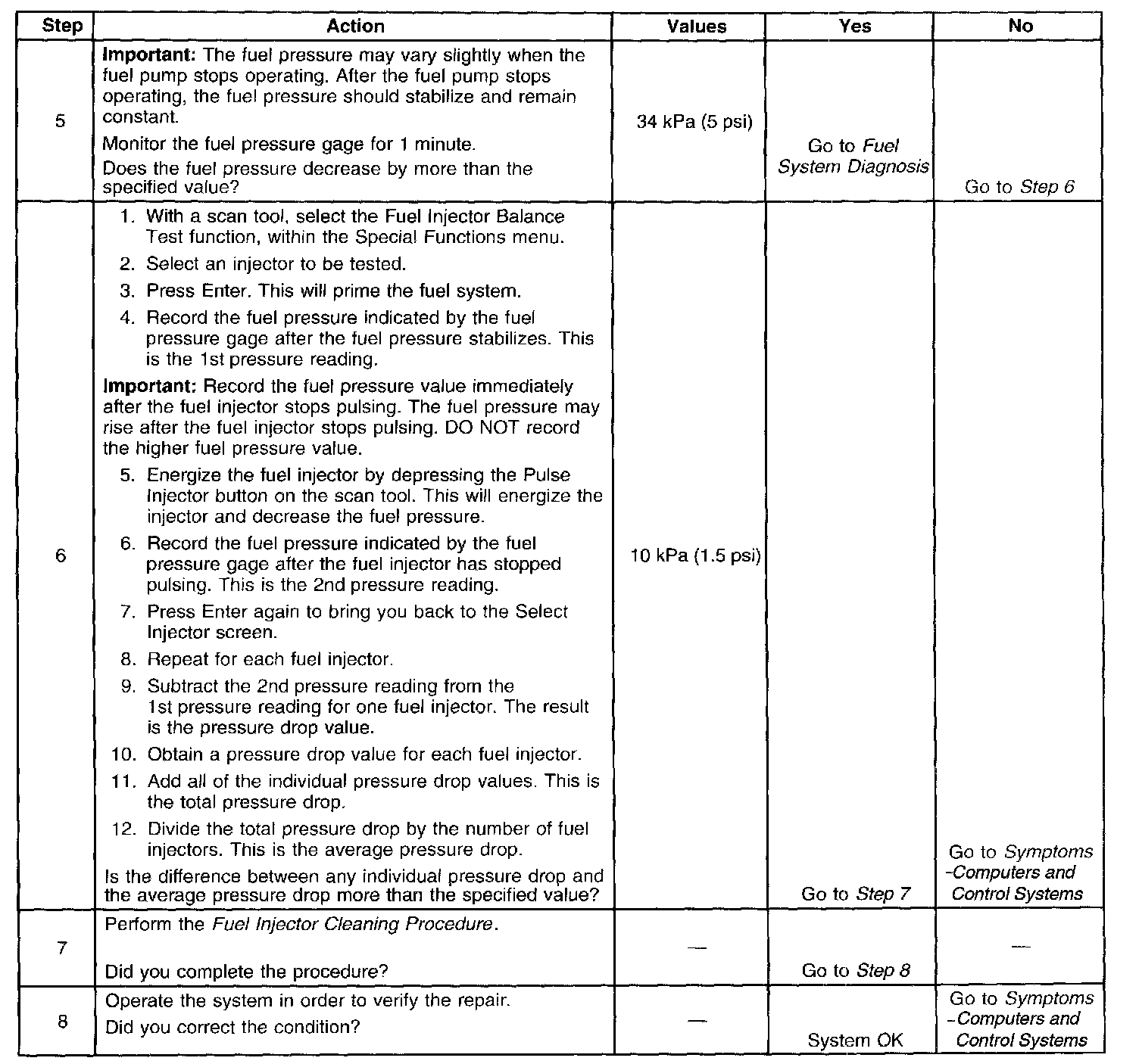 The scan tool is first used to energize the fuel pump relay. The scan tool is then used to pulse each injector for a precise amount of time allowing a measured amount of fuel into the manifold. This causes a drop in system fuel pressure that can be recorded and used to compare each injector.