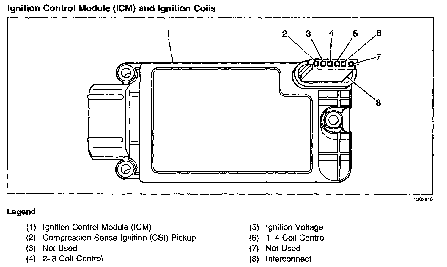 The powertrain control module (PCM) supplies a signal on each of the ignition control (IC) timing control circuits to the ignition control module (ICM). The ICM fires the correct ignition coil at the correct time based on the signals. The ICM detects if cylinder 1 or cylinder 3 is on the compression stroke by sensing the secondary voltage and polarity of each side of the ignition coil. The ICM detects this voltage with sensing circuitry integrated into each ignition coil. The higher voltage is on the compressing cylinder. This is called compression sense ignition. The ICM provides a synthesized cam signal to the PCM based on these inputs. The PCM uses the cam signal to synchronize fuel injection.