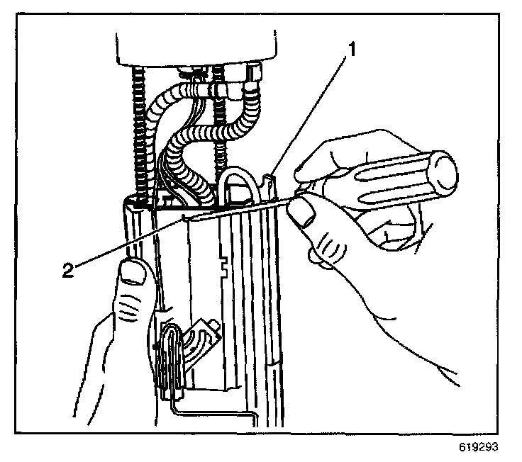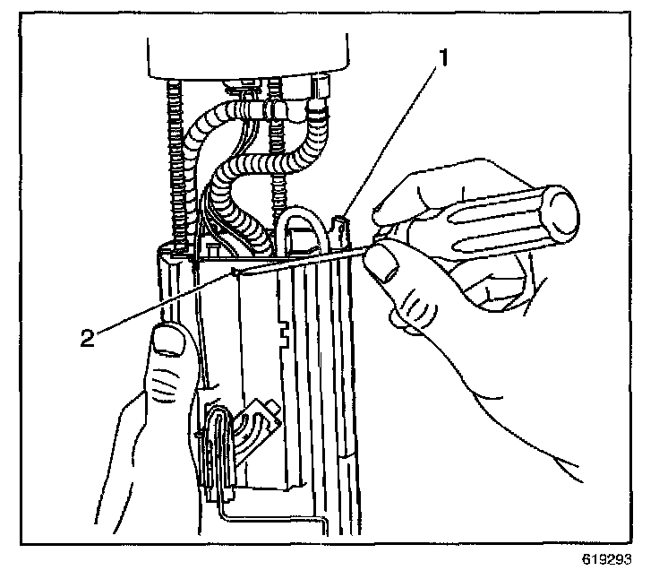 2. Remove the fuel pump and fuel level sensor electrical retaining clip at the top of the fuel sender assembly.