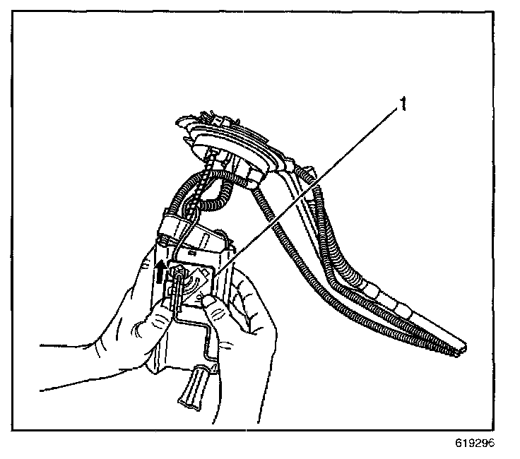 5. Depress the tab on the fuel level sensor (1) while sliding up and out of the housing.