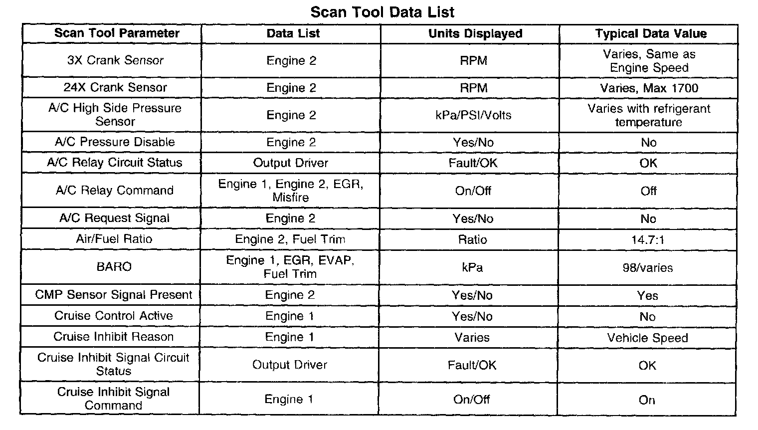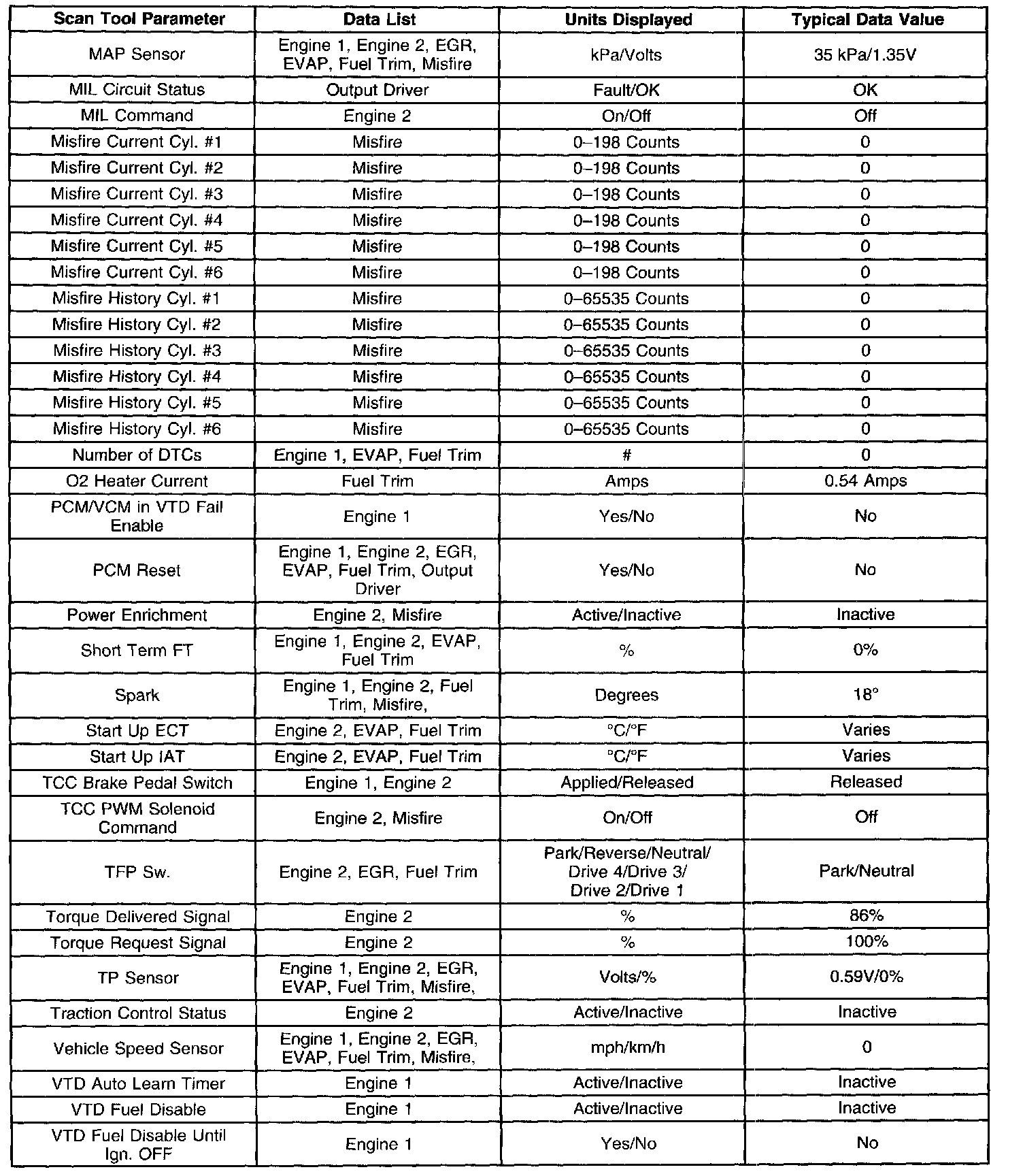 Only the parameters listed below are referred for use in diagnosis. For further information on using the scan tool to diagnose the powertrain control module (PCM) and related sensors, refer to the applicable reference section listed below. If all values are within the typical range described below, refer to Symptoms-Computers and Control Systems. Symptom Related Diagnostic Procedures The Typical Scan Data Values table contains all the parameters included in the following data lists arranged in alphabetical order: