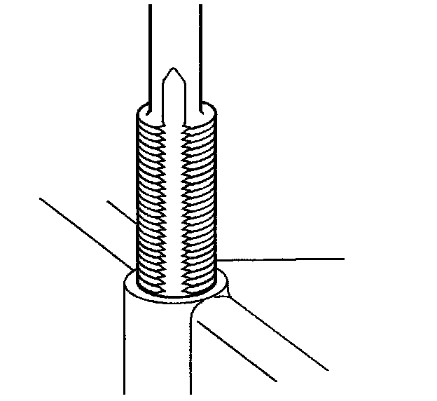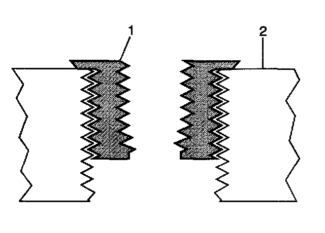Important: The use of a cutting type fluid GM P/N United States 1052864, GM P/N Canada 992881, WD 40 or equivalent is recommended when performing the drilling, counterboring and tapping procedures. When installed to the proper depth, the flange (1) of the insert will be seated against surface (2) of the base material of the drilled/tapped hole.