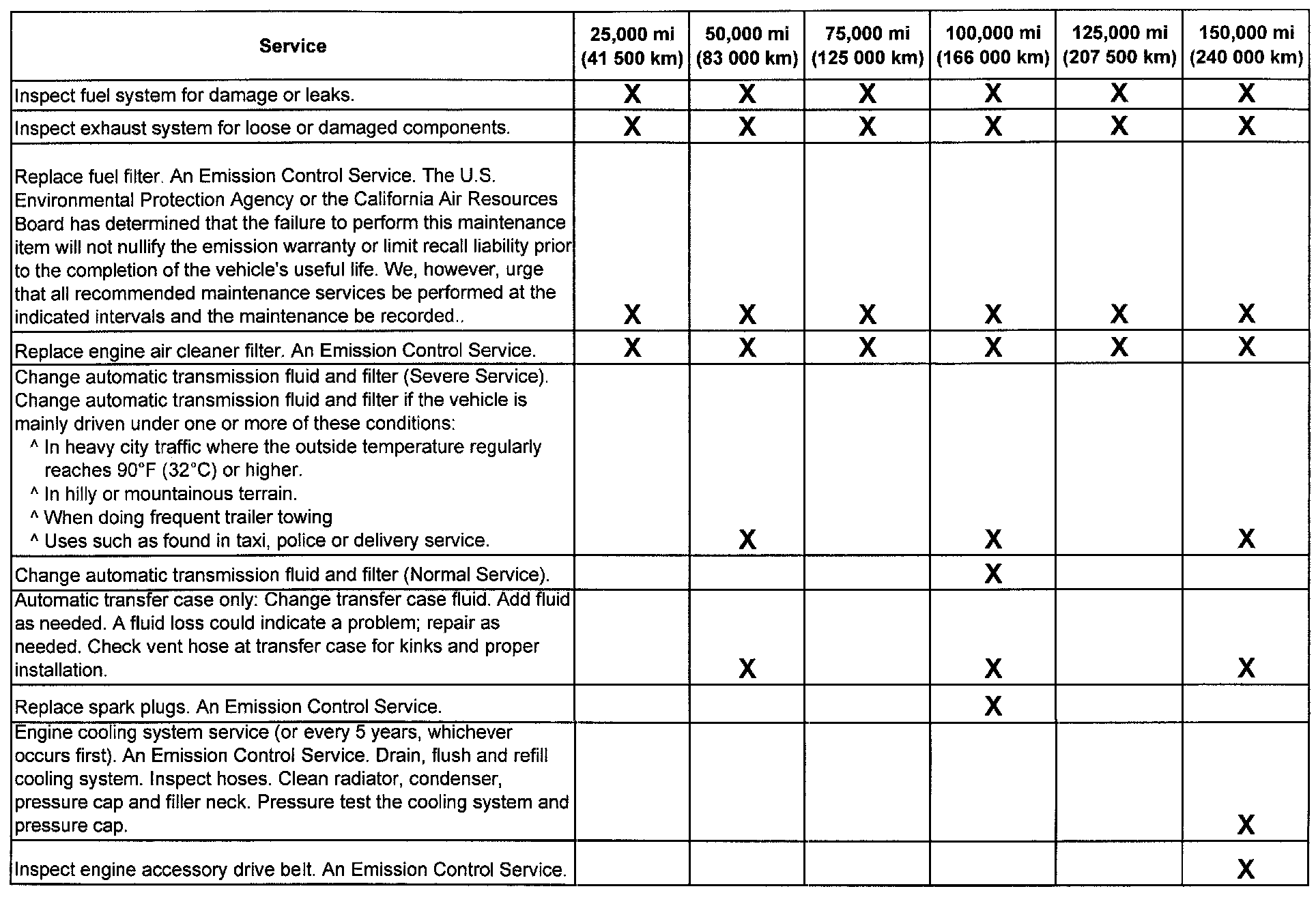 (Maintenance I or Maintenance II) after the indicated kilometers (miles) shown for each item.