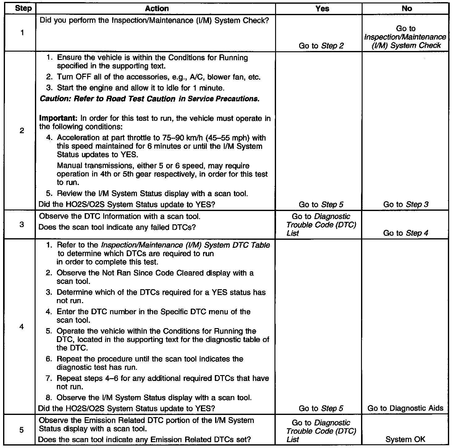 The purpose of this test is to satisfy the enable criteria necessary to execute inspection/maintenance (I/M) readiness diagnostics for the oxygen sensor (O2S, HO2S) system. The test may be used to set the I/M System Status to YES. The I/M System Status display on the scan tool provides an indication of whether the control module has completed the required tests. The l/M System Status does not indicate that the tests have passed or failed. When all of the diagnostics for a specific system have run and passed, the I/M System Status will update to YES. If a test for a specific system has failed, the I/M System Status will update to YES, indicating a determination was made, even if all of the other tests for that system have not run.