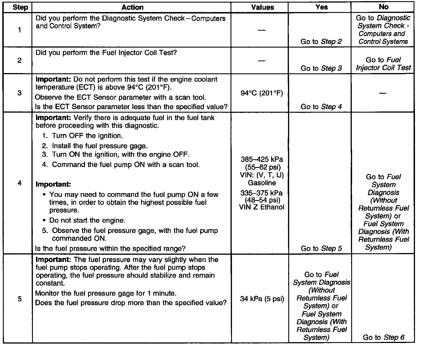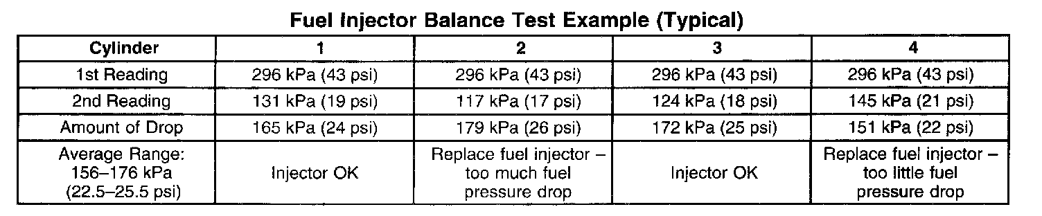 6. If the pressure drop value for each fuel injector is within 10 kPa (1.5 psi) of the average pressure drop value, the fuel injectors are flowing properly. Calculate the pressure drop value for each fuel injector by subtracting the second pressure reading from the first pressure reading. Refer to the illustration.
