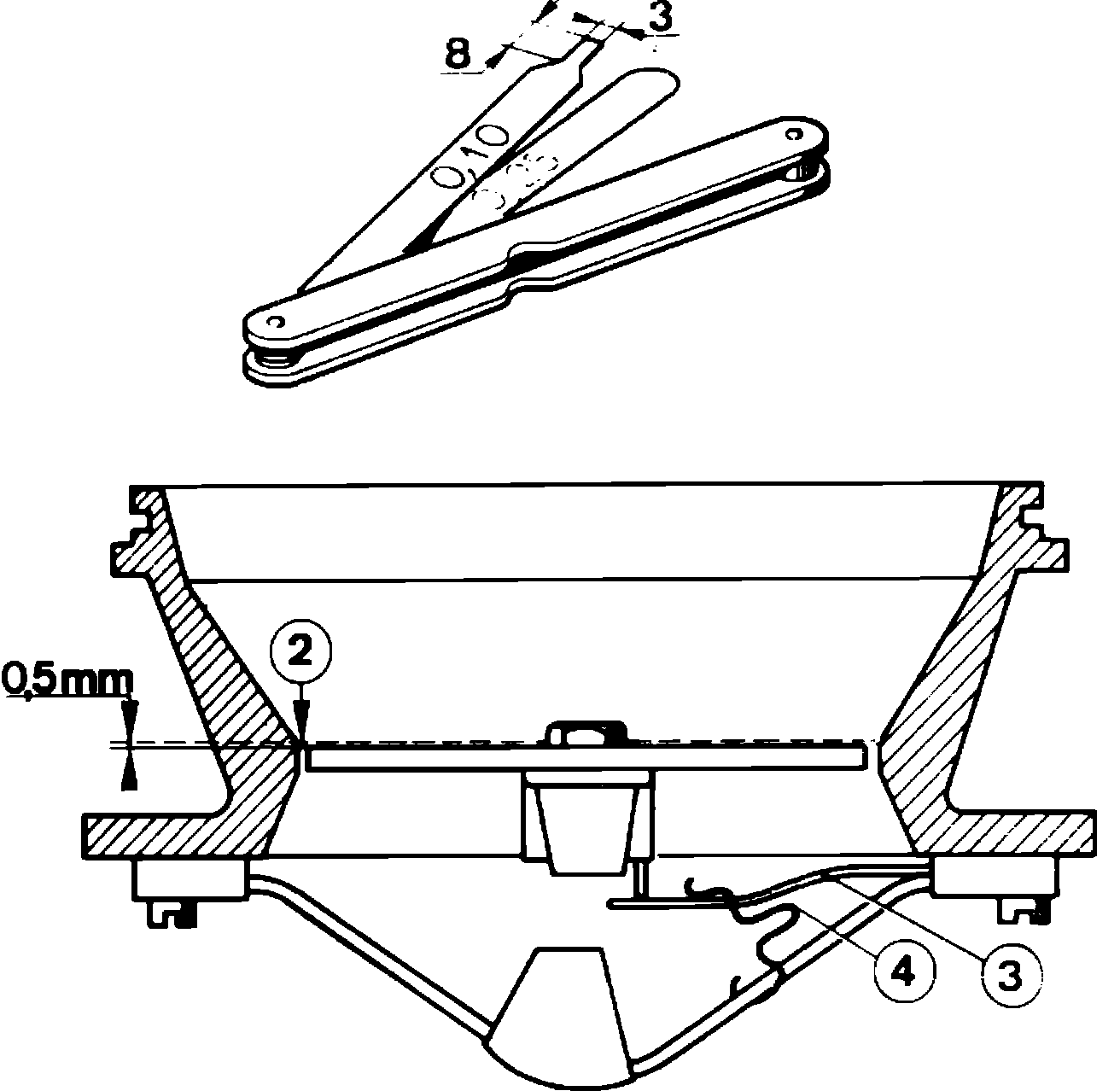 3. When plate is in rest position, upper face of sensor plate must be level with beginning of funnel. Plate should be no lower than .020'' below edge of funnel (2), Fig. 8. If necessary position of blade (3) may be altered by bending spring (4). Sensor plate must be installed with TOP or five punch marks facing up.