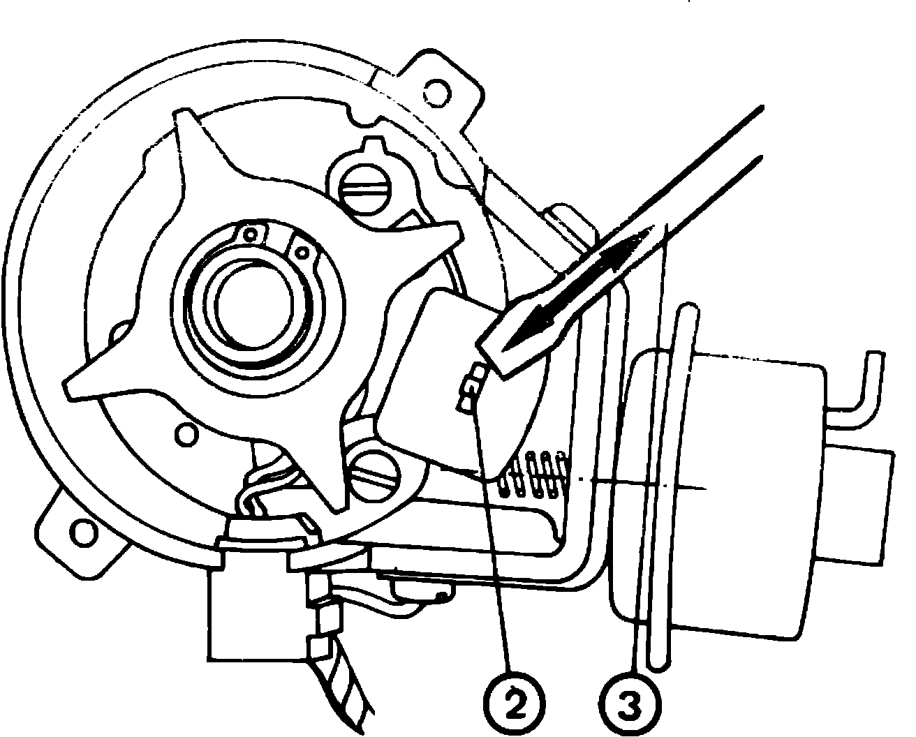 1. Remove distributor cap, then rotate crankshaft by hand until vanes of trigger wheel are positioned on either side of pulse generator pole piece, Fig. 2.