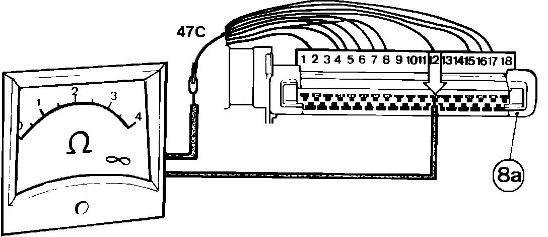 7. If this is not the case, check the connections of wire 47 R on Pin #12 of the connector (8a), Fig. 9, the continuity of wire 47R, Fig. 9, and the operation of the thermocontact (7), Fig. 27.
