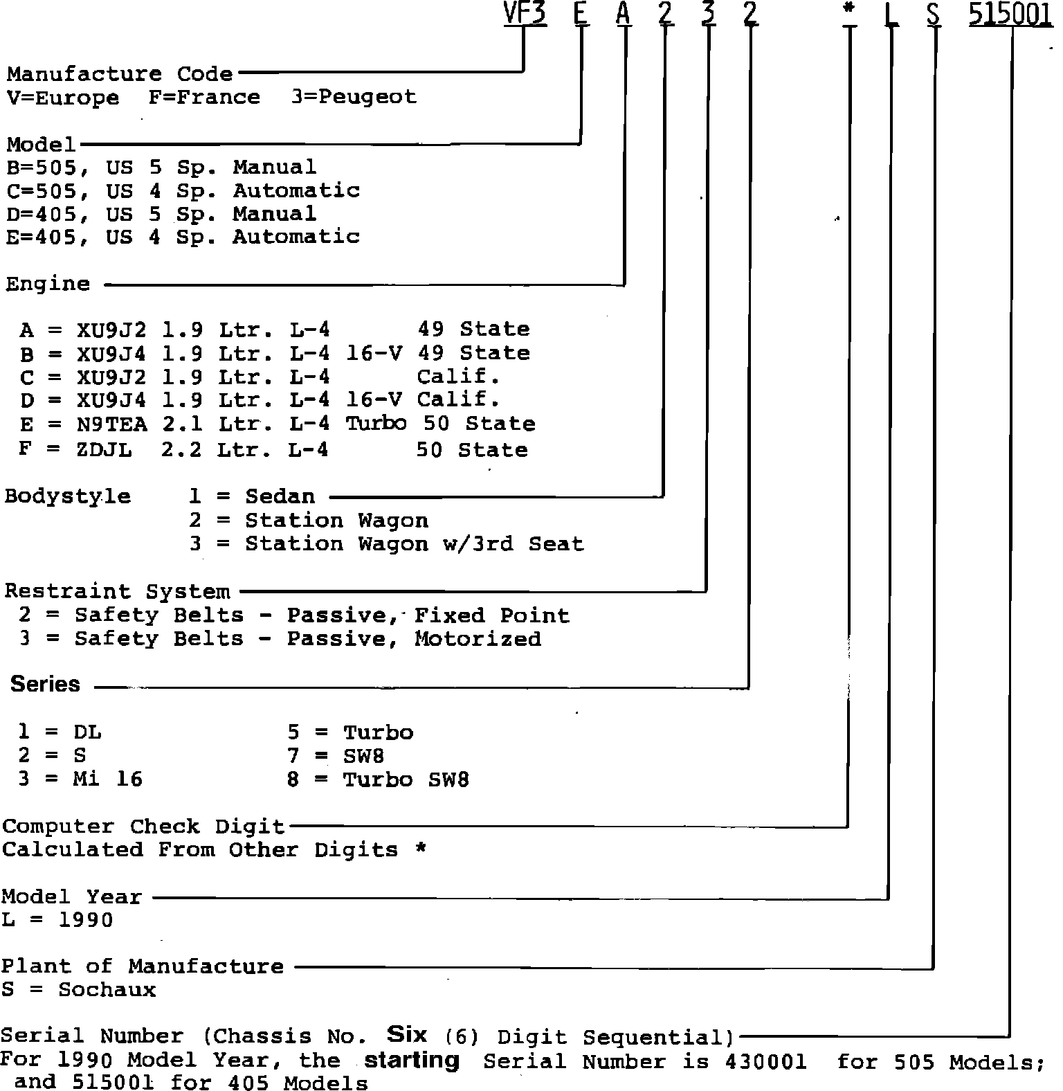 The purpose of this bulletin is to assist the dealers personnel with the seventeen (17) digit 1990 Model Year Vehicle Identification Numbers for both 405 and 505 Models.