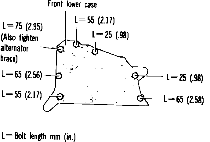 4. Place new front lower case gasket on cylinder block. Install front lower case while inserting silent shaft into cylinder block. Torque flange bolts to 9-10 ft. lbs.
